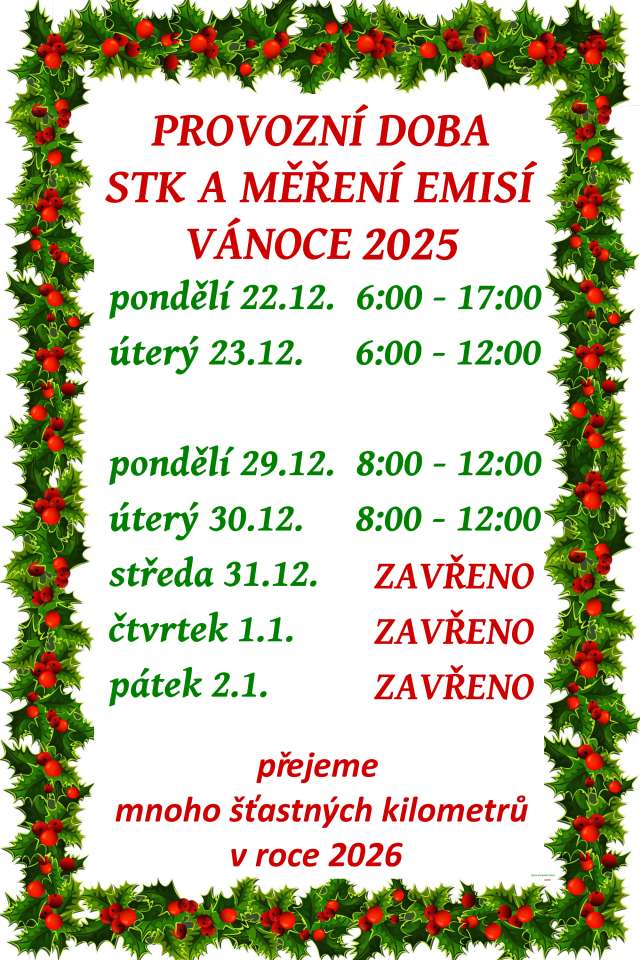 Provozní doba platí i pro stanice měření emisí. Na měření emisí a na technickou prohlídku se prosím objednejte - telefonicky nebo online (záložka "Rezervace")